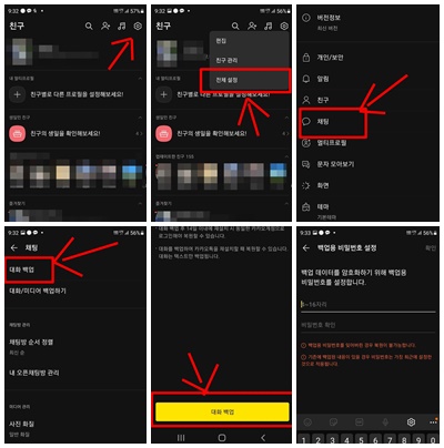 - 카카오톡 접속 -> 오른쪽 상단에 톱니바퀴 -> 전체 설정 -> 채팅 -> 대화 백업 클릭 -> 백업 데이터 암호화하기 위한 비밀번호 설정 ( 비밀번호는 한번 잊어버리면 찾기가 불가능합니다. 0000으로 하는 걸 추천드립니다^-^)