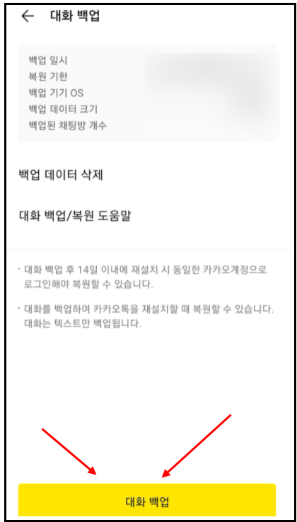 5. 백업 일시, 본원 기한, 백업된 채팅방 개수 등등 나오는데요. 맨 아래쪽에 대화 백업을 눌러주면 바로 백업이 됩니다.